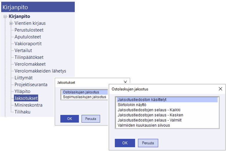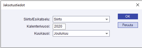 Kun haluat tehdä jaksotuksia, valitse Jaksotustiedoston käsittelyt. Tämän jälkeen valitaan, tehdäänkö siirto vai siirron esikatselu, sekä mihin kalenterivuoteen ja kuukauteen jaksotus kohdistuu.