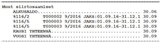 Jaksotustositteen siirtolokin saat tarvittaessa uudelleen ruudulle Siirtolokin näyttö-toiminnolla. Uusin jaksotus näkyy siirtolokilla viimeisenä. Huomioithan, että jaksotustosite ei jaksota arvonlisäveroa. Jaksotus näkyy esimerkiksi kirjanpidon pääkirjalla seuraavasti: