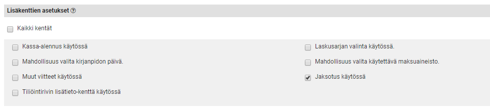 Ostolasku jaksotetaan MaestroNG:ssä tiliriveittäin. Ostolaskun jaksottamista varten tarvittavat lisäkentät saat näkyviin Asetuksista: