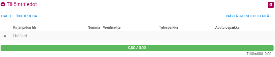 Tarkasta taloushallinnon Maestrosta, että KiPin tiliöintitiedoista löytyy jaksotuksen tasetili. Tulostili ei ole pakollinen tieto.