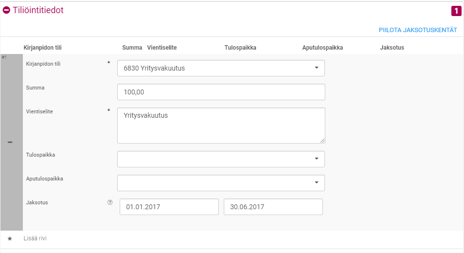 Kun tämä asetus on päällä, saat laskulle näkyviin jaksotuskentät Näytä jaksotuskentät -linkistä tiliöinnin yläpuolelta: