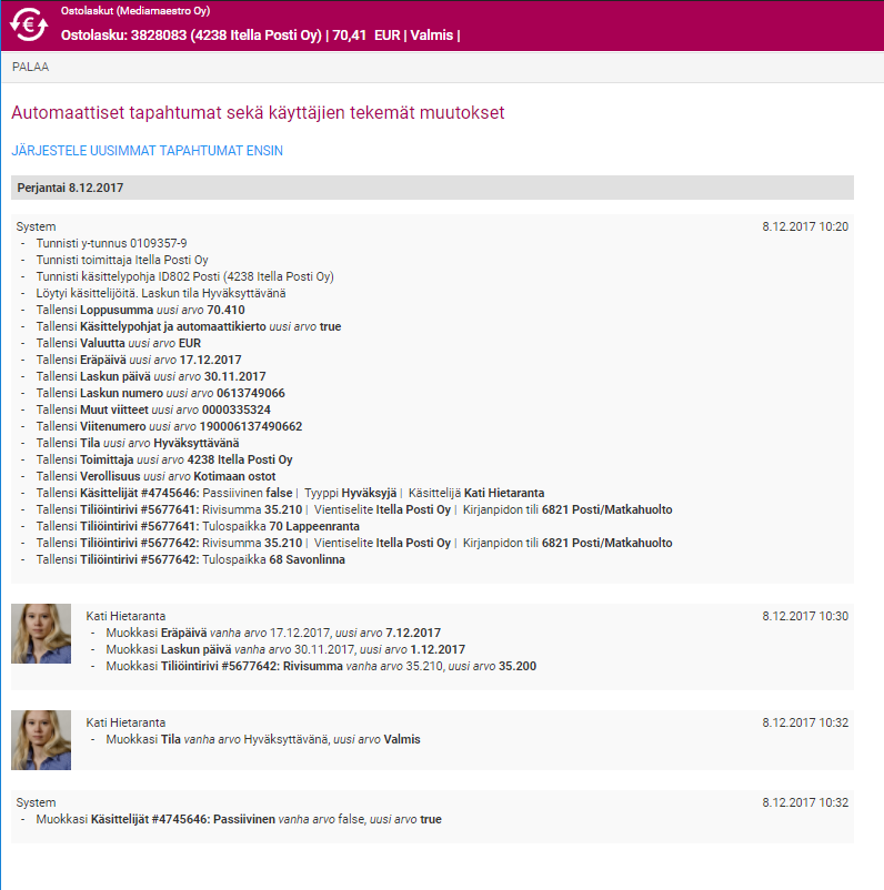 Ostolaskun muutoshistoria näyttää kaikki MaestroNG Ostolaskujen automaattiset ja käyttäjien tekemät muutokset laskulle. Muutoshistoriasta näet esimerkiksi toimittajan ja käsittelypohjan tunnistukset, automaattiset tallennukset, tiliöinti- ja tilamuutokset sekä syyt, miksi laskua ei ole voitu viedä valmiiksi. Lokin avulla voidaan selvittää laskun käsittelyn kulku ja mahdolliset virhetilanteet.