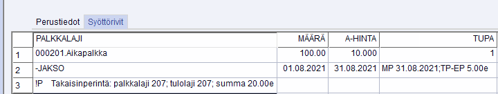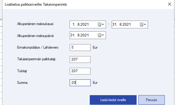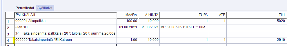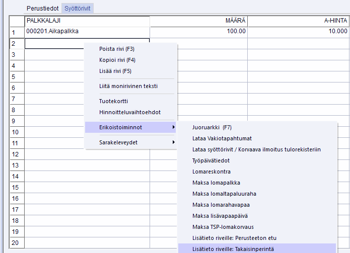 Kahden ylimmän rivin tietojen syötön voi tehdä helpoiten valitsemalla palkkariveillä F8 Erikoistoiminnot/Lisätieto riveille: Takaisinperintä. Tiedot voi tarvittaessa syöttää myös käsin.