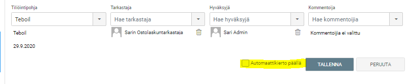 Käsittelypohjalle on valittava Tasajako- tai Prosenttiosuudet -tyyppinen käsittelypohja, jotta Automaattikierto päälle -valinta tulee näkyviin.