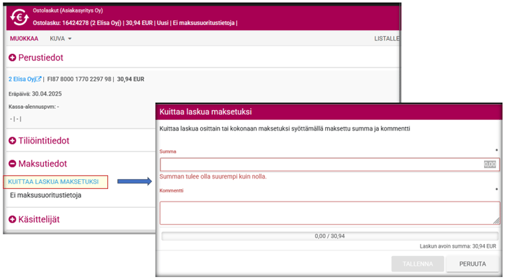 NGmaksatus - maksatuksen käyttöönotto / Maksetut laskut pois maksettavien laskujen listalta Julkaisupäivä 30.04.2025 Klikkaa lasku auki maksatuksen laskulistalta. Valitse KUITTAA LASKUA MAKSETUKSI. Kommentti-kenttään lisätään maksutietojen selitys.