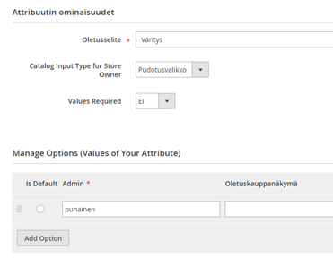 - Manage options (tämä tulee esille, jos kentän tyyppi on "pudotusvalikko"), tähän voit listata vaihtoehdot tälle attribuutille Add option-painiketta painamalla (esim. "väri" ominaisuden vaihtoehdot: "punainen, sininen, vihreä".. jokainen vaihtoehto tulee omalle rivilleen)