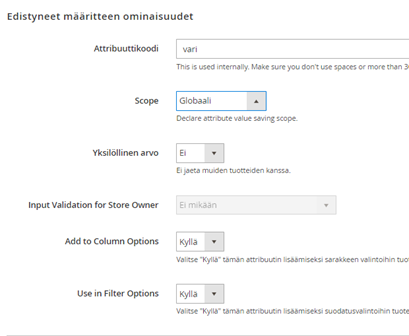 - Catalog input type for store owner: kentän tyyppi (teksti, monivalinta..). Jos ominaisuuteen perustuen on tarve rakentaa muokattavia tuotteita tai käyttää ominaisuutta filtteritekijänä kaupassa, valitse tähän "Pudotusvalikko", "Visual swatch" tai "Text swatch"