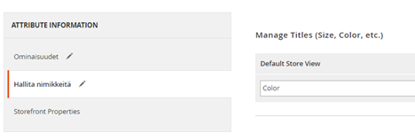 - Hallita nimikeitä -välilehdellä voidaan ominaisuuden otsikko (miten se asiakkaalle näkyy) määrittää (esim. "Väri" suomen kauppanäkymään, "Color"