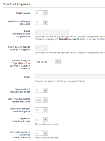 - Käytetään tuotteen lajittelussa tuotelistauksessa: Eli voidaanko kategoriassa lajitella tuotteita kyseisen omnaisuuden mukaan
