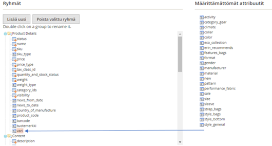 Kun uusi ominaisuus on tallennettu, tulee se lisätä ominaisuusjoukkoon, jotta se tulee käyttöön: Admin-paneelissa Kaupat/Attribuutit->Attribuuttiryhmä.