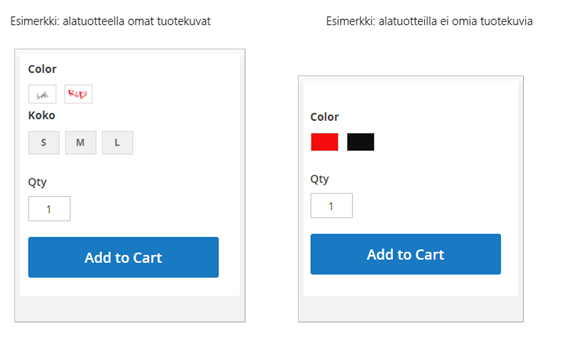 - Jos yksittäisellä tuotteella on määritetty oma kuva, muokattavan tuotteen kuva vaihtuu kaupassa alituotteen kuvaksi valinnan/swatchin perusteella