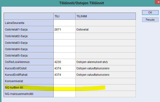 Kirjanpito - Ylläpito - Kipin tiliöintitiedot --> Ostojen tiliöinnit --> NG kuittien tili ---> tähän on määriteltävä NG:ssä yksipuolisesti tiliöityjen kuittien vastatili.
