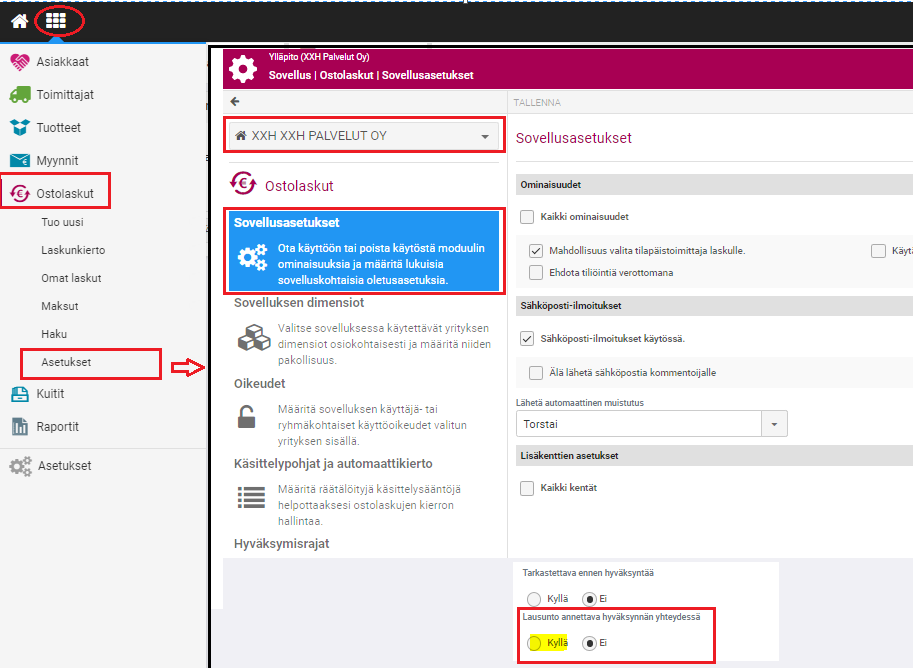 Sovelluskuutio -> Ostolaskut - Asetukset --> valitaan yritys -> Sovellusasetukset