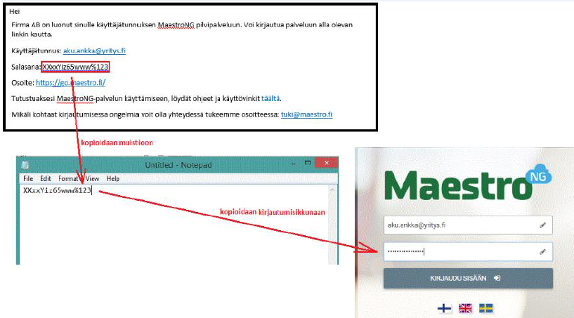 Jos kirjautumisessa ilmenee ongelmia, kopio saamasi salasana sähköpostiviestistä muistioon tai johonkin muuhun tietokoneeltasi löytyvään teksti – asiakirjaan.