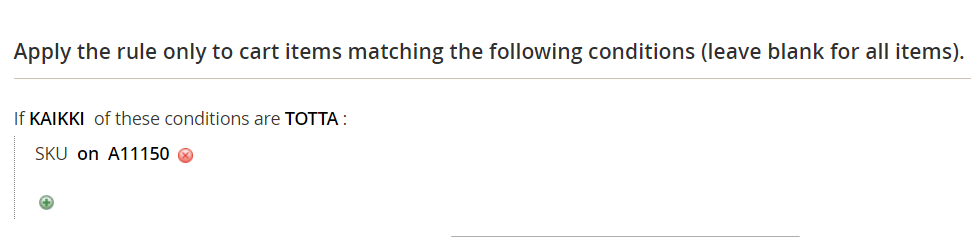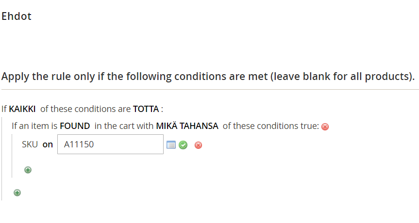 Ja sääntöihin lisätään vielä samat valinnat kuin ehdot - välilehdellä, että alennus tulee vain kyseisestä tuotteesta.