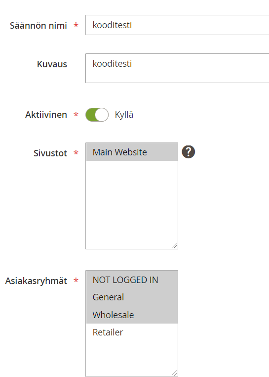 Alennuskoodilla alennus yhdestä tuotteesta ostoskorissa tehdään seuraavasti. Anna säännölle kuvaava nimi ja kuvaus, että tiedät usemman säännön ollessa käytössä mistä säännöstä on kysymys. Aseta sääntö aktiiviseksi.