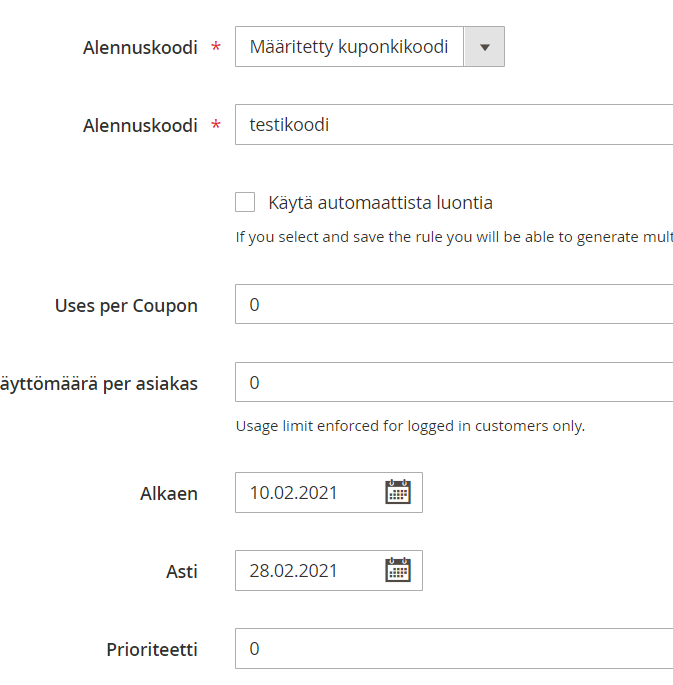 Voit valita myös montako kertaa kupongin saa käyttää tai montako kertaa yksi asiakas voi kupongin käyttää.