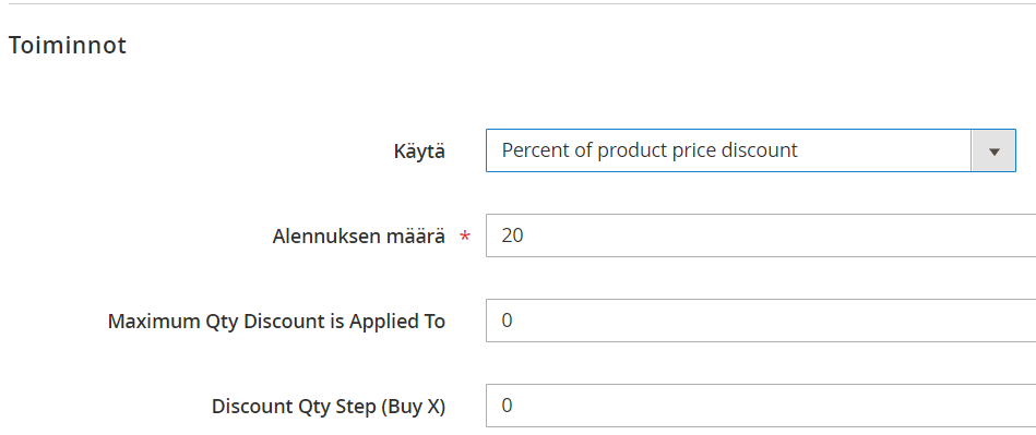 Toiminnot välilehdellä valitaan joko prosenttimäärä tai summa, jonka tuotteesta saa