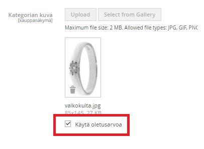 Oletuarvot ei aina ole käytössä tuosta syystä, joten mikäli kategoriassa näkyy kuva vaikka sitä ei oletusnäkymässä ole niin tulisi katsoa kauppanäkymästä onko oletusrasti päällä. Se tapahtuu seuraavasti: