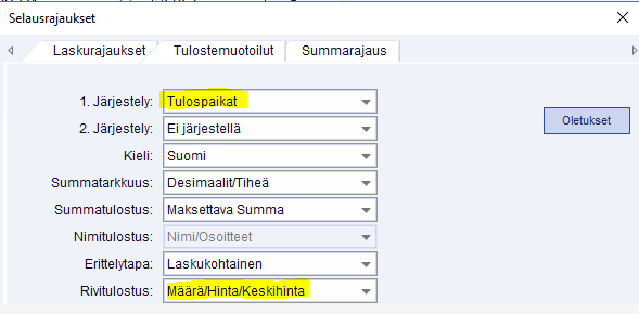 Kun sopiva raportti on valittu, rivitulostus kenttään valitaan "määrä/hinta/keskihinta", jolloin ohjelma hakee tulospaikkatiedon palkkakirjauksen riveiltä. Raportin voi järjestellä tulospaikoittain.