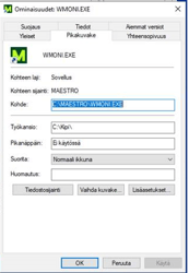 Tee pikakuvake työaseman työpöydälle, määritä siihen Kohde ja Työkansio ao. mukaisesti. Levykirjain sen mukaan missä levyjaossa Maestro sijaitsee.
