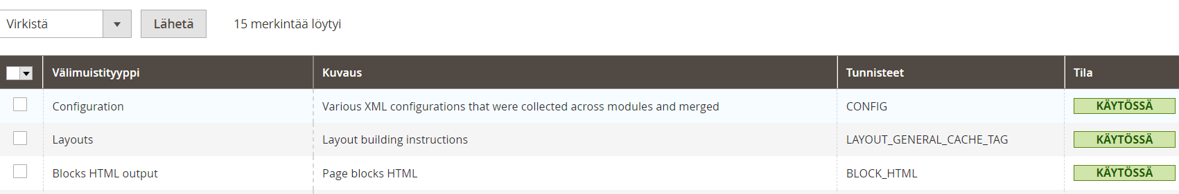 Tarkista, ensin kohdasta Järjestelmä → Työkalut → Välimuistin hallinta onko jokin osio punaisena, kun normaalisti kaikki on vihreänä, kuten kuvassa alla. Joissakin tapauksissa kaikki kohdat saattaa olla vihreällä, joten välimuistin tyhjennys kuitenkin saattaa auttaa siinä, että jokin puuttuva osio päivittyy halutunlaiseksi.