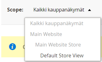 Alla olevassa kuvassa Kaikki kauppanäkymät on se, missä on oletusasetukset ja Default Store View alla on kauppanäkymäkohtaiset asetukset (nämä eri kauppanäkymien määrä ja nimet voivat poiketa alla olevasta).