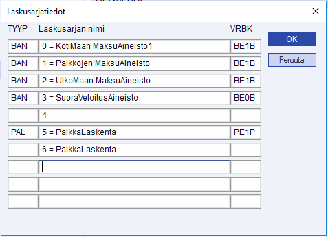 Jos palkkojen kirjanpitosiirrossa tulee virheilmoitus "Laskusarjatiedosto (3) puuttuu", tarkista Tiedosto > Palkat > Yleistiedot > Laskusarjatiedot, onko ikkuna tyhjä. Jos ikkuna on tyhjä eli palkkojen laskusarjatiedot puuttuvat, voit kopioida ne toiselta yritykseltä, jolle lasketaan palkkoja. Alla esimerkki laskusarjatiedoista, kun käytössä on vain yksi palkkojen laskusarja (5). Samassa ikkunassa ilmoitetaan myös pankkiliikenteen maksuaineistot.