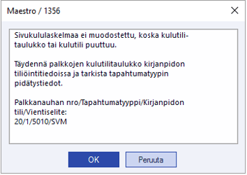Sivukululaskelmaa ei muodostettu, koska kulutilitaulukko tai kulutili puuttuu