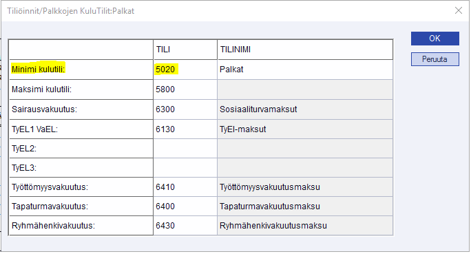 Sivukulujen jaksotuksia varten kulutilit määritellään Kirjanpito > Ylläpito > Kipin tiliöintitiedot > Palkkojen Kulutilit -taulukossa. Kulutilitaulukoita voi olla useita erilaisia. Esimerkissä kulutilitaulukko käsittää palkkatiliöinnit tilistä 5020 alkaen, joten siksi tilin 5010 osalta sairausvakuutusmaksun jaksotus kirjanpitoon ei onnistu.