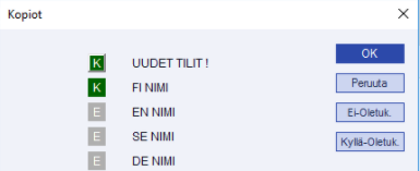 Uudet, perustetut tilit, sekä muokatut tilien nimet voidaan kopioida seuraavalle tilikaudelle valitsemalla Kirjanpito > Ylläpito > Kopiot kaudelle 20xx > UUDET TILIT ja/tai FI NIMI mukaan kopiointiin (tarvittaessa myös muunkieliset nimet):