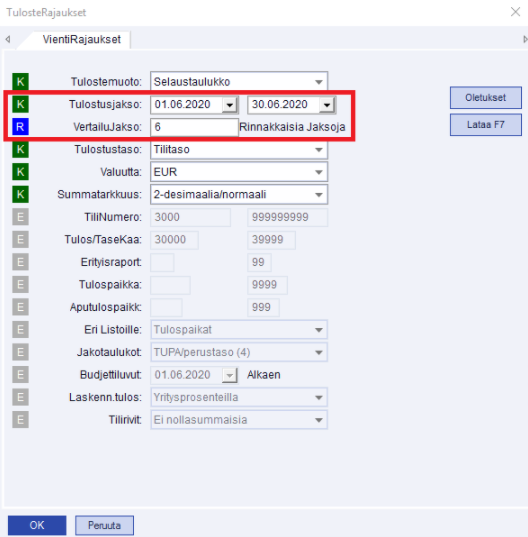 Tuloslaskelmaan saadaan tulostettua rinnakkain kuukausiluvut Vertailut > Tuloslaskelma-raportilla. Valitaan tulostusjaksoksi viimeisin tulostettava kuukausi. Vertailujakso-valinnaksi otetaan R ja ilmoitetaan tulostettavien kuukausien lukumäärä.