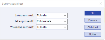 Seuraavassa ikkunassa valitaan Jaksosummat: Tulostetaan, ja tarvittaessa myös Jaksoprosentit ja Yhteensäsummat.