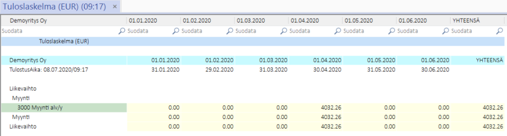 Tuloslaskelmaan kuukausiluvut rinnakkain