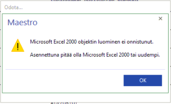Mikäli Maestrossa tulee alla oleva ilmoitus, konesaliasiakkaan Citrix-tunnukselta puuttuu todennäköisesti Microsoft Office -lisenssi. Kun lisenssi on käytössä, Maestro-ympäristö avataan kuvakkeesta, jonka nimessä on MS Officella. OpenOffice/LibreOffice on käytettävissä oletuksena.