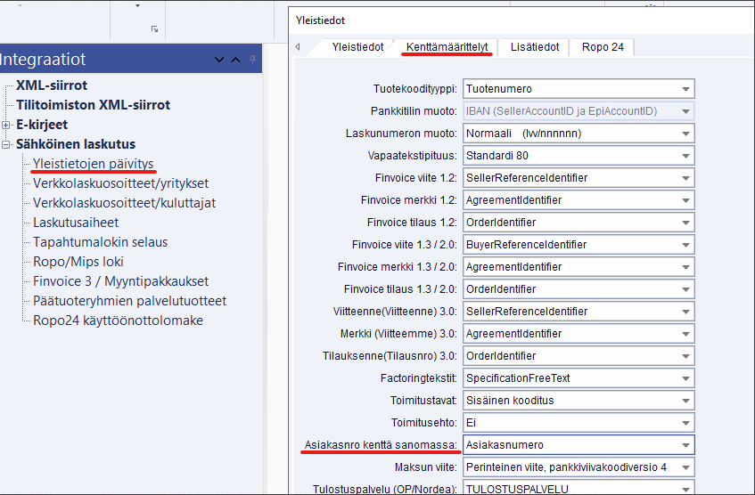 Integraatiot - Sähköinen laskutus - Yleistietojen päivitys - Kenttämäärittelyt välilehti - Asiakasnro kenttä sanomassa.