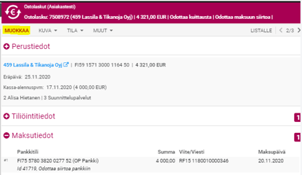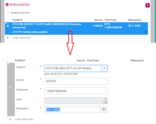 Ennen maksupäivää pystyy laskulle syötettyä maksutietoa muokkaamaan.