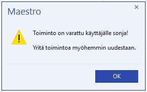 Jos kirjaus edelleen näyttää olevan varattu ko. käyttäjälle, kyseisen käyttäjän tulee käynnistää Maestro uudelleen, jotta kirjaus vapautuu.
