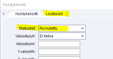 sekä Lisätiedot-välilehdelle statustiedoksi "Romutettu"