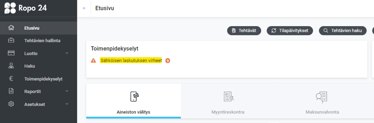 Virheeseen jääneitä laskuja voitte seurata Ropo24 -palvelussa kohdassa Toimenpidekyselyt. Etusivulla näätte heti jos laskuja on jäänyt virheeseen. Klikkaamalla Sähköisen laskutuksen virheet linkkiä pääsette suoraan listalle jossa näette laskut tarkemmin.