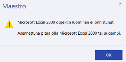 Jos Maestroa käyttäessäsi tulee ilmoitus: Microsoft Excel 2000 objektin luominen ei onnistunut