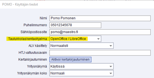 Kuinka taulukkolaskentaohjelma on täällä määritelty ko. käyttäjällä, jonka tunnuksella tulostusta tehdään: