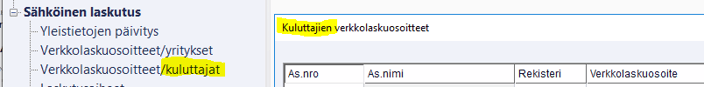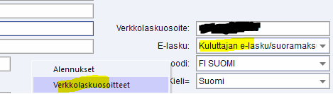 - Esim. asiakaskortilla, harmaalla alueella -> hiiren oikealla avautusta valikosta: Verkkolaskuosoitteet