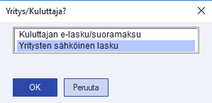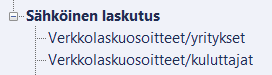 Jos käytössänne on vain yritysten väliset verkkolaskut, tällöin on mahdollista käyttää vain Verkkolaskut / Yritykset -verkkolaskuosoitteistoa. Jos asiakkaalle on vahingossa asetettu kuluttajan E-lasku, virheilmoitus voi aiheutua tästä.