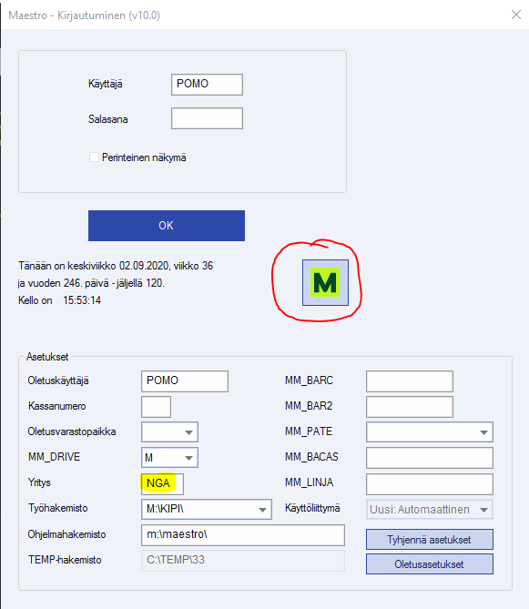 Kirjautuessa Maestroon ko. tunnuksella, M -kuvakkeesta avautuu kirjautumisasetukset: