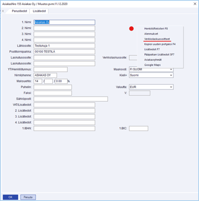 Verkkolaskuosoitteet voidaan päivittää joko asiakaskortin tai verkkolaskuosoitteiston kautta.