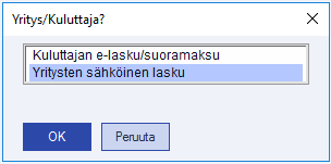 - Finvoicen versio: Oletus. Tulee automaattisesti oletuksena Sähköisen laskutuksen Yleistiedoista, mutta voidaan tarvittaessa asiakaskohtaisesti muuttaa. Suositeltavaa käyttää ensisijaisesti suurinta/uusinta versionumeroa kentän valinnoista.