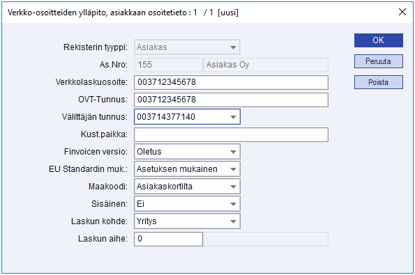 - Verkkolaskuosoite: Kirjaa asiakkaan ilmoittama verkkolaskuosoite (usein muotoa 0037+y-tunnus tai pankin tilinumero)