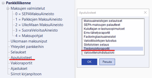 Verkkolaskujen lähetysvirheet voi tarkistaa kohdasta Pankit - Pankkiliikenne - Aputulosteet - Tiedonsiirtoraportit - Valitse pankki