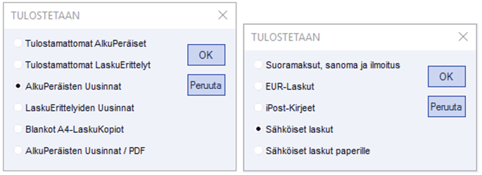 Laskun voi tulostaa uudelleen sähköisenä kohdassa Myynnit - Myyntilaskut - Laskun tulostus - AlkuPeräisten Uusinnat - Sähköiset laskut